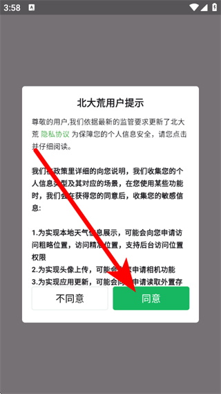 1、打开北大荒农服,在提示弹窗中,点击同意。