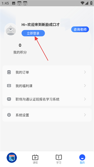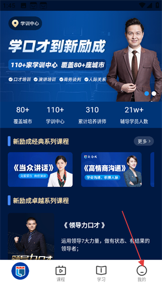 1、在新励成口才首页,点击右下角我的选项,进入个人页面。