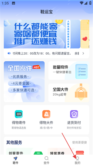 鞋运宝是专注快递物流的寄件查件服务平台,整合得物寄件、退货到付、劵码兑换、分享返佣、快递查件等核心功能,支持各类大小件寄送,提供上门取件服务,省去用户到店寄件时间,通过劵码兑换享受优惠下单,实时追踪物流进度,让寄件查件更便捷高效,满足日常寄件、退货等多元物流需求,成为省心实用的物流服务载体。