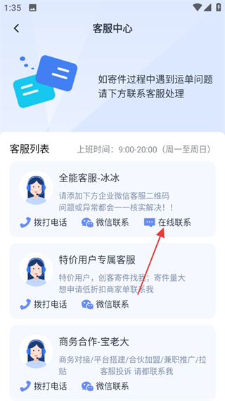 3、在客服中心页面,点击在线联系,即可联系人工客服。