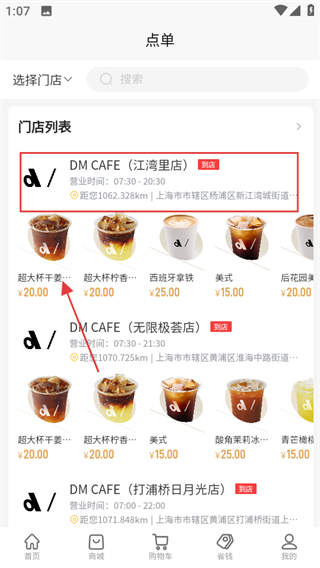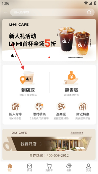 1、在DM CAFE首页,点击到店取选项,进入点单页面。