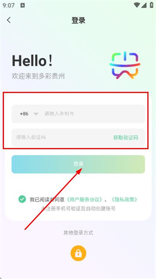 3、在登录页面填写手机号,获取并填写验证码,确认勾选协议后点击登录完成账号登录操作。
