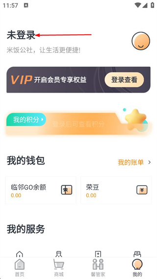 1、在米饭公社APP首页,点击底部我的,进入个人中心页面。