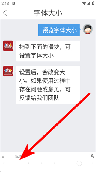 4、在字体大小页面,拖动滑块,调整至标准等目标字号,完成设置。