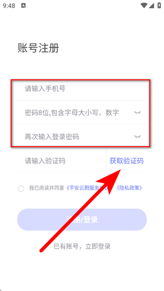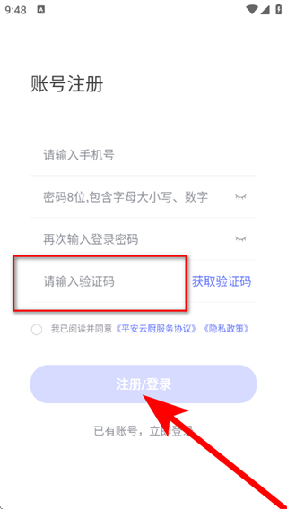 4、输入收到的验证码,勾选协议后,点击注册登录,完成账号注册。