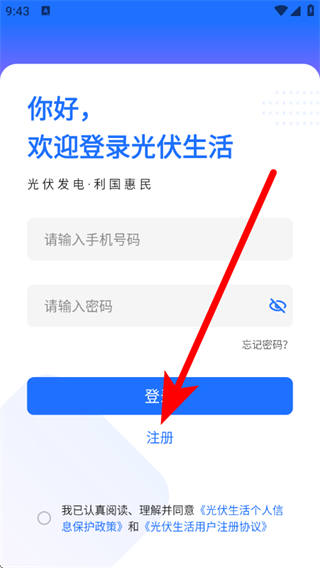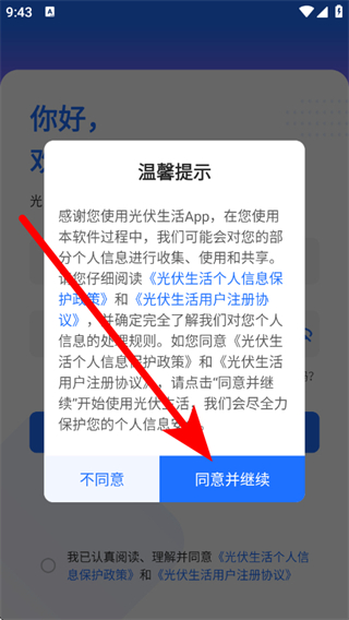 1、打开光伏生活,在温馨提示弹窗中,点击同意并继续。