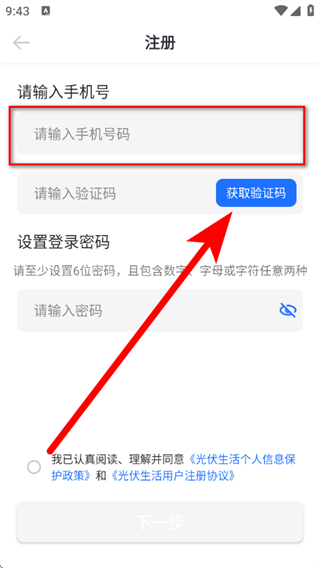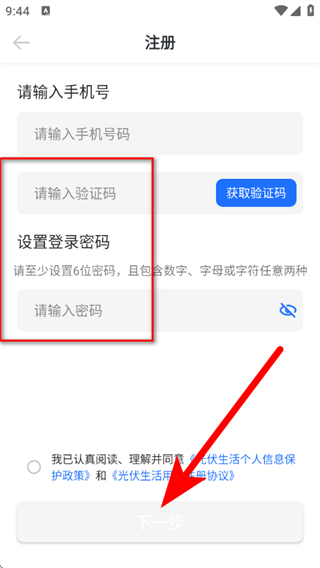 4、填写收到的验证码,设置登录密码,勾选协议后,点击下一步,完成注册。