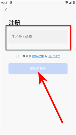 3、在注册页面,输入框中填写信息,勾选后,点击获取验证码。