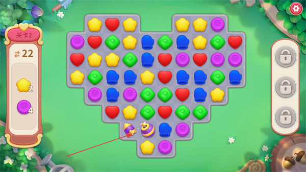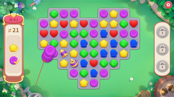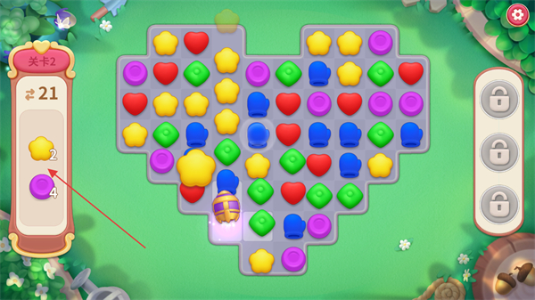 1、在关卡2中,消除相同颜色的图标,积累左侧目标道具黄色星星、紫色道具,推进关卡进度。