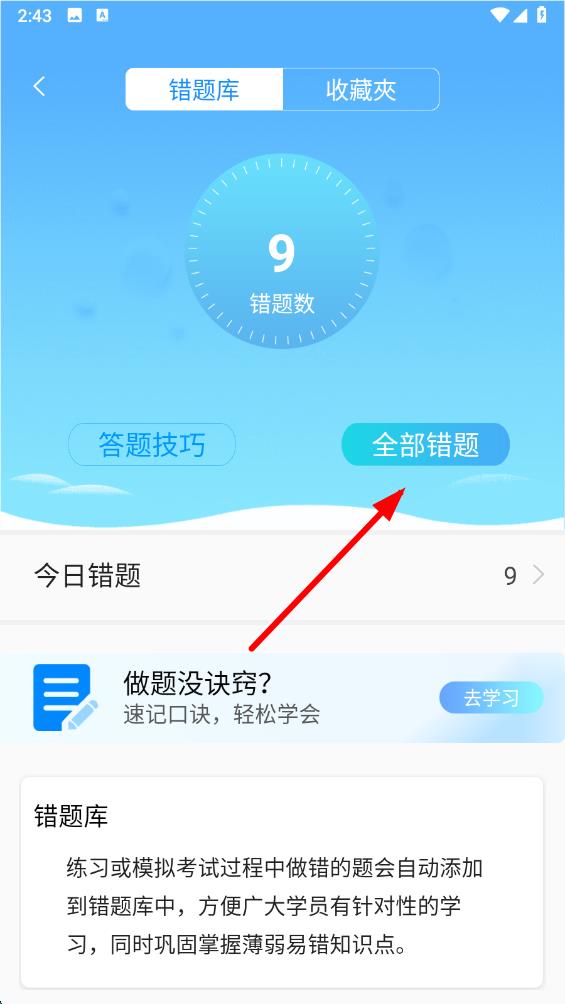 3、在错题库页面,点击全部错题按钮,即可查看所有做错的题目。