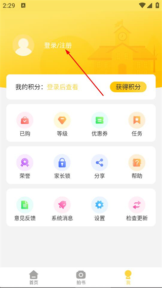 2、在个人中心页面,点击登录/注册,进入登录界面。