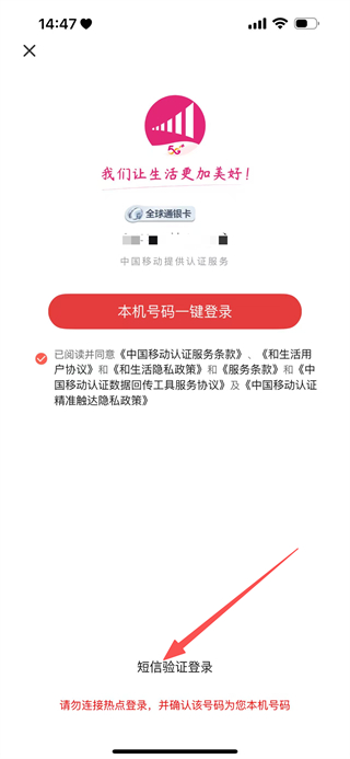 3、在登录选择界面,点击短信验证登录,进入短信登录页面。