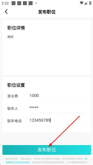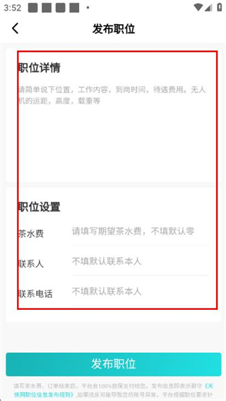 2、在发布职位页面,填写职位详情,以及职位设置里的茶水费、联系人、联系电话等信息。