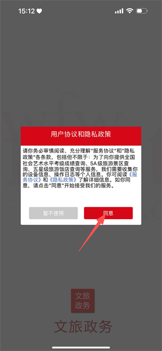 1、在文旅政务的用户协议和隐私政策弹窗中,点击同意,进入首页。