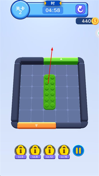 1、关卡2中移动绿色长条积木至顶部绿色区域,使积木与区域颜色形状匹配,完成该关卡要求。
