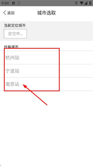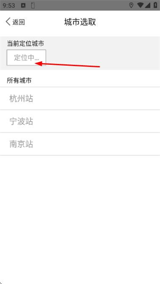 2、在城市选取页面,可点击定位中获取当前定位城市,或查看所有城市列表。