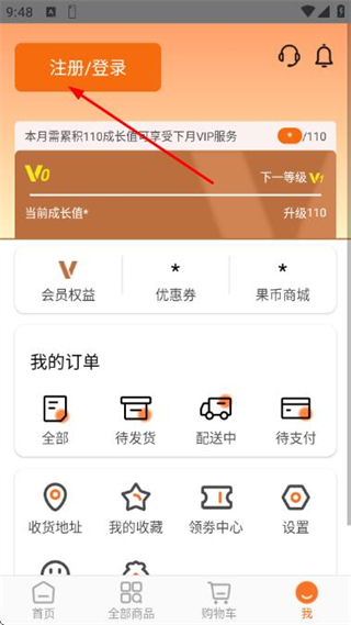 2、在个人中心页面点击注册登录按钮,进入登录页面。