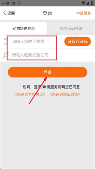 3、在登录页面的动态短信登录模式下,填写手机号和验证码,勾选相关协议后点击登录完成账号注册登录操作。