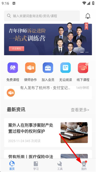 1、在无讼首页,点击底部导航栏的我的选项,进入个人中心页面。