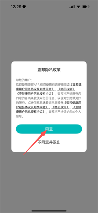 1、在壹邦隐私政策弹窗中,点击同意,进入应用首页。
