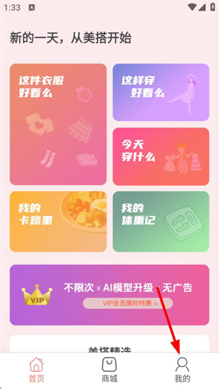 1、在美搭首页,点击底部的我的选项,进入个人中心页面。