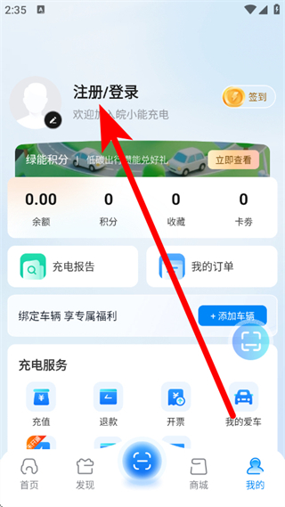 2、在个人中心页面,点击注册登录,进入登录界面。