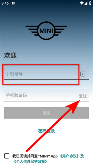 3、在登录页面,输入手机号,点击发送获取验证码。