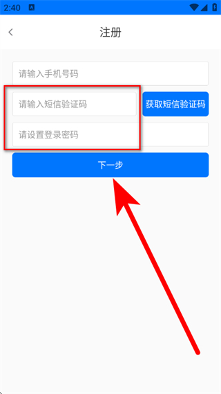 4、在输入框中,输入验证码,设置密码后,点击下一步,完成注册。