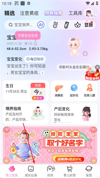 1、在妈妈网孕育App首页点击底部的成长记录选项,进入成长记录页面。