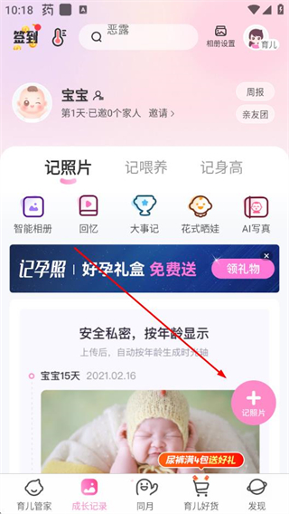 2、在成长记录页面选择记照片标签,点击记照,可上传宝宝照片记录成长瞬间。
