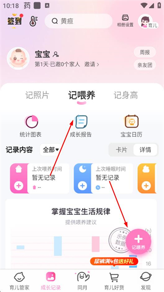 3、切换到记喂养标签,点击记喂养,可记录宝宝的喂养时间、方式等信息。