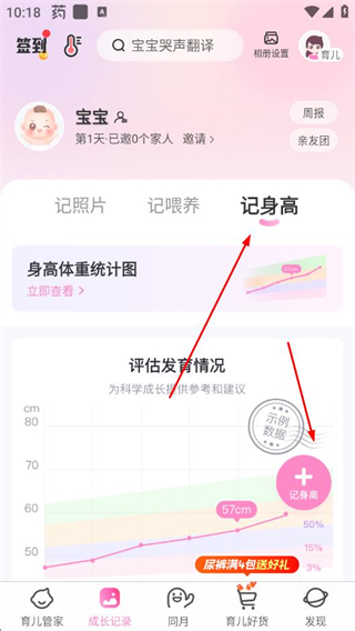4、切换成记身高标签,点击记身高,可录入宝宝的身高、体重数据,跟踪发育情况。