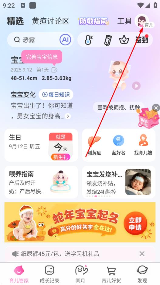 1、打开妈妈网孕育应用,点击页面右上角的育儿图标。