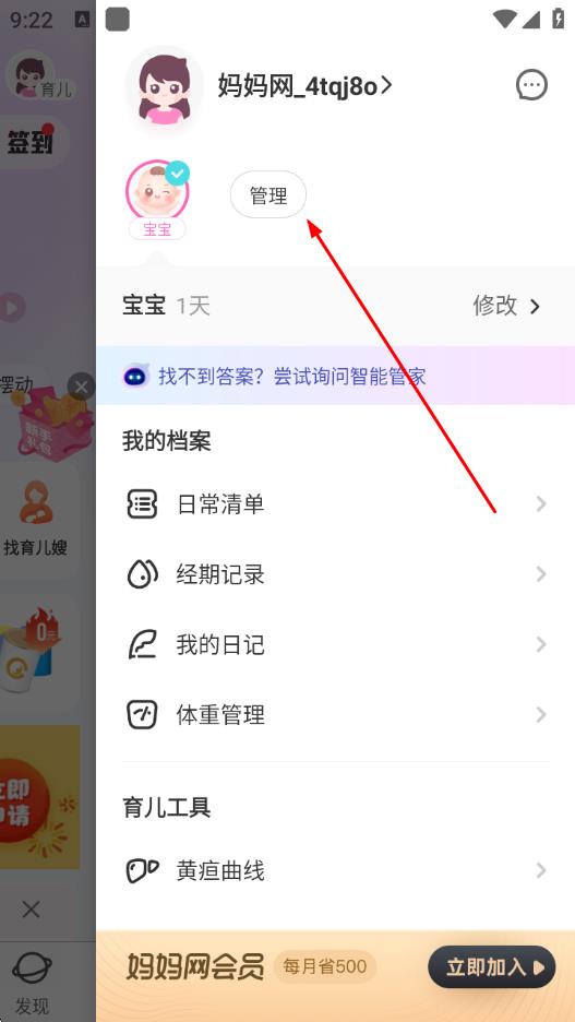 2、在弹出的侧边栏中,点击宝宝头像旁的管理选项。
