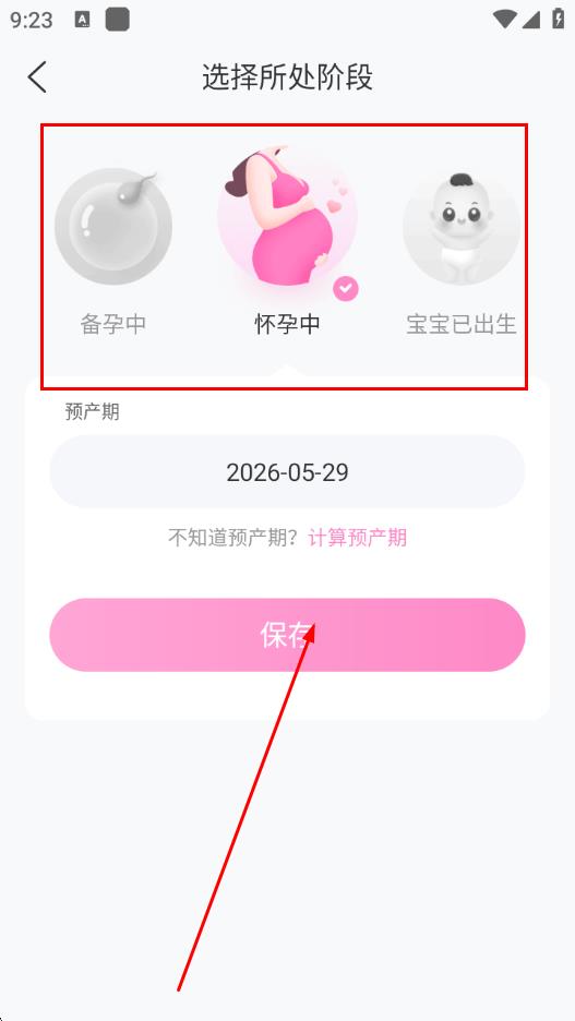 4、在选择所处阶段页面,选择二胎对应的状态,点击保存按钮,完成二胎信息添加。