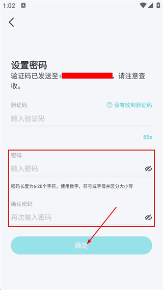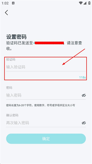 4、在设置密码页面,输入收到的验证码,进行下一步。