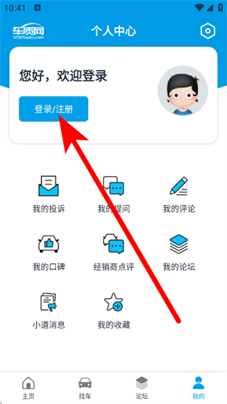 2、在个人中心页面,点击登录注册,进入注册页面。