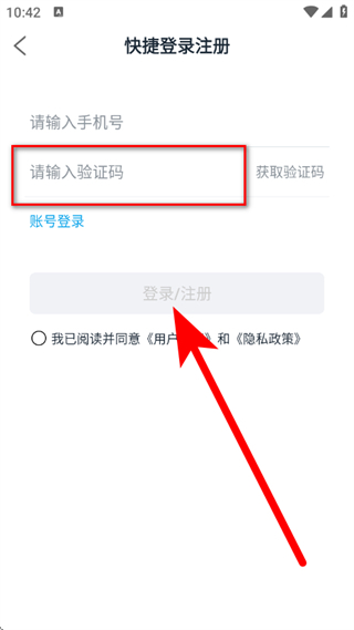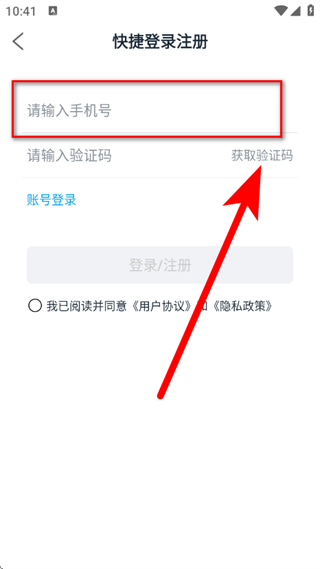 3、在快捷登录注册页面,输入手机号,点击获取验证码。