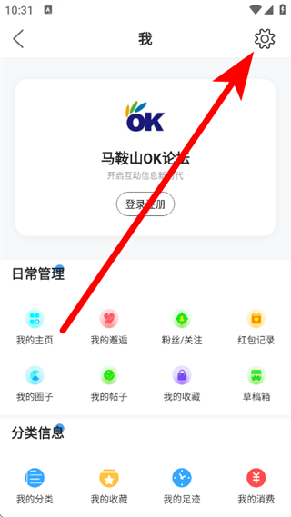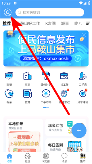 1、打开马鞍山ok论坛,点击首页左上角的头像图标。
