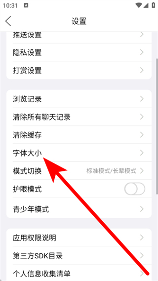 3、在设置页面,选择字体大小,进入字体大小页面。