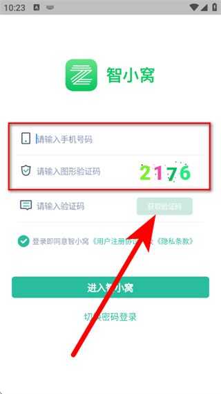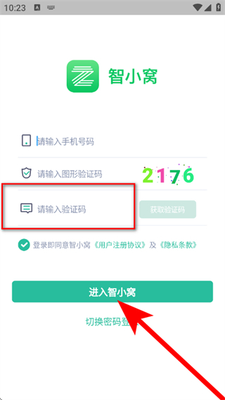 4、在输入验证码框,输入验证码,勾选协议后,点击进入智小窝。
