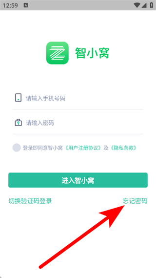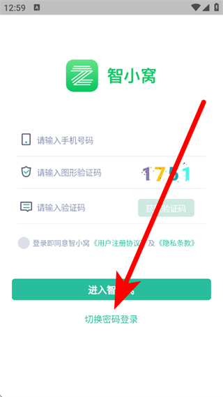 1、打开智小窝,在登录页面,点击切换密码登录。