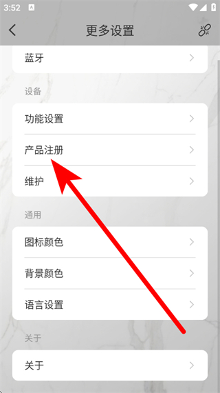 3、在更多设置页面,点击选择产品注册,进入注册页面。