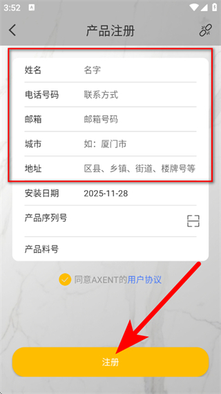 4、在产品注册页面,填写姓名、电话号码等信息,确认同意协议后,点击注册,完成产品绑定。