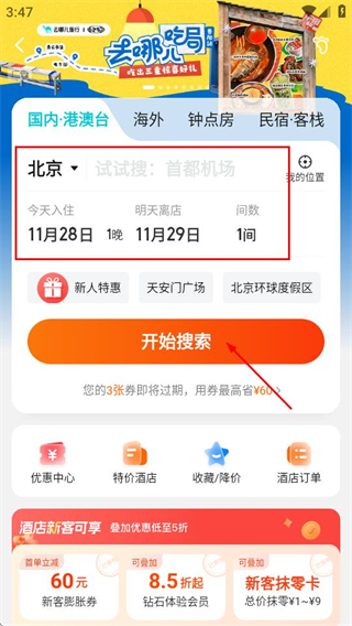 2、在酒店预订页面,选择信息,点击开始搜索按钮,进入酒店列表页面。