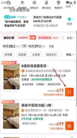 4、在酒店详情页面,选择目标房型后点击订按钮,进入入住信息填写页面。
