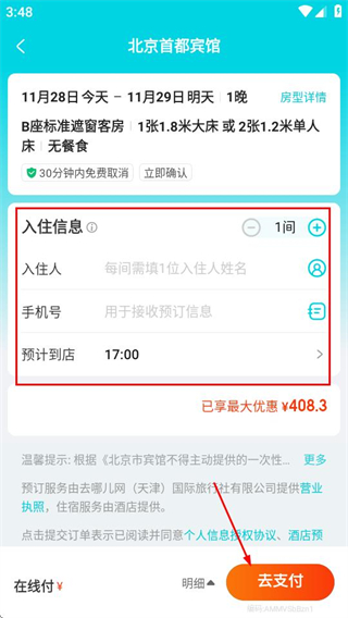 5、在入住信息页面,填写信息后,点击去支付完成酒店预订。