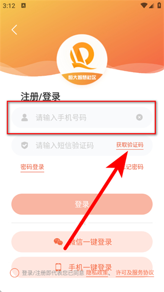 3、在注册登录页面,输入手机号码,点击获取验证码。