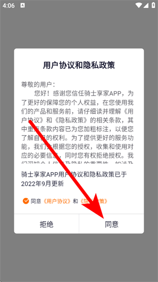1、打开骑士享家,在隐私政策弹窗中勾选后,点击同意。