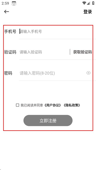 3、在注册页面,填写信息,勾选协议后点击立即注册完成注册。